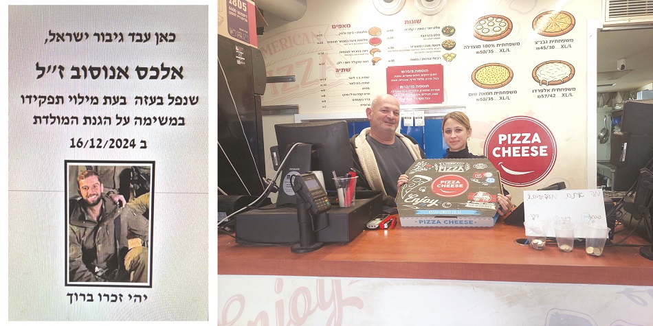 11 שנים חלפו מאז שפתח איתי חגואל את פיצה צ'יז במרכז מרל"ז בעיר, ובין הצעירים הרבים שעבדו אצלו לאורך השנים היה גם אלכס אנוסוב, תושב העיר שנפל במלחמה וכעת זוכה לפיצה על שמו. השבוע סיפר חגואל כי כל ההכנסות מ"הפיצה של אלכס" יוקדשו להנצחתו של העובד לשעבר.
