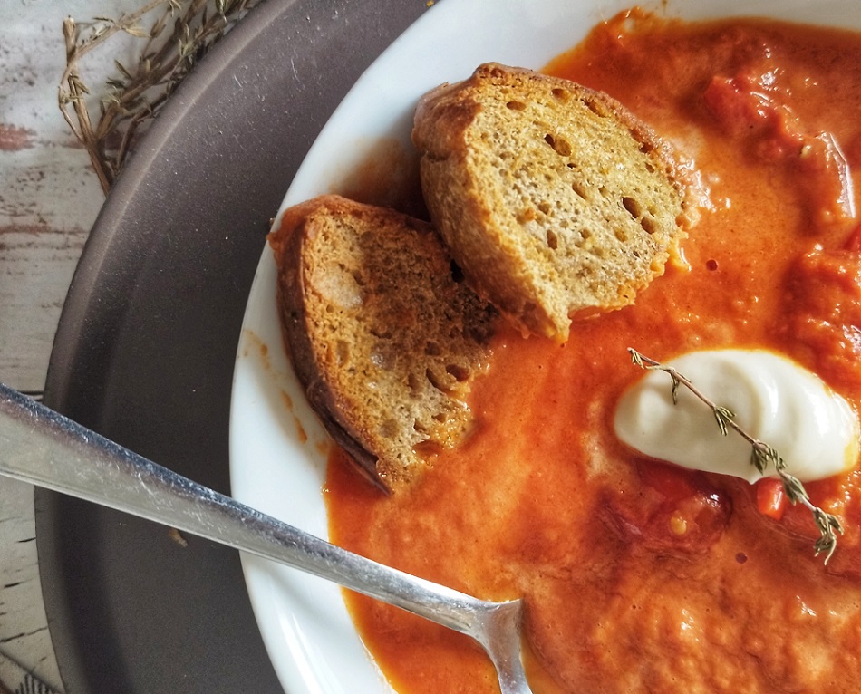 מרק קרמי, חם ומנחם עם עגבניות שרי, שום ומעט קרם קוקוס שמסמיך ומעניק מרקם קרמי וטעם משגע. אם אתם פחות אוהבים את טעם הקוקוס, אפשר להחליף בשמנת צמחית לבישול או שמנת מתוקה.